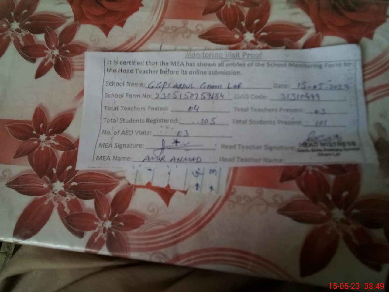 | EMIS Code: 31310499 | Name of School: GGPS GHANI LAR | |||