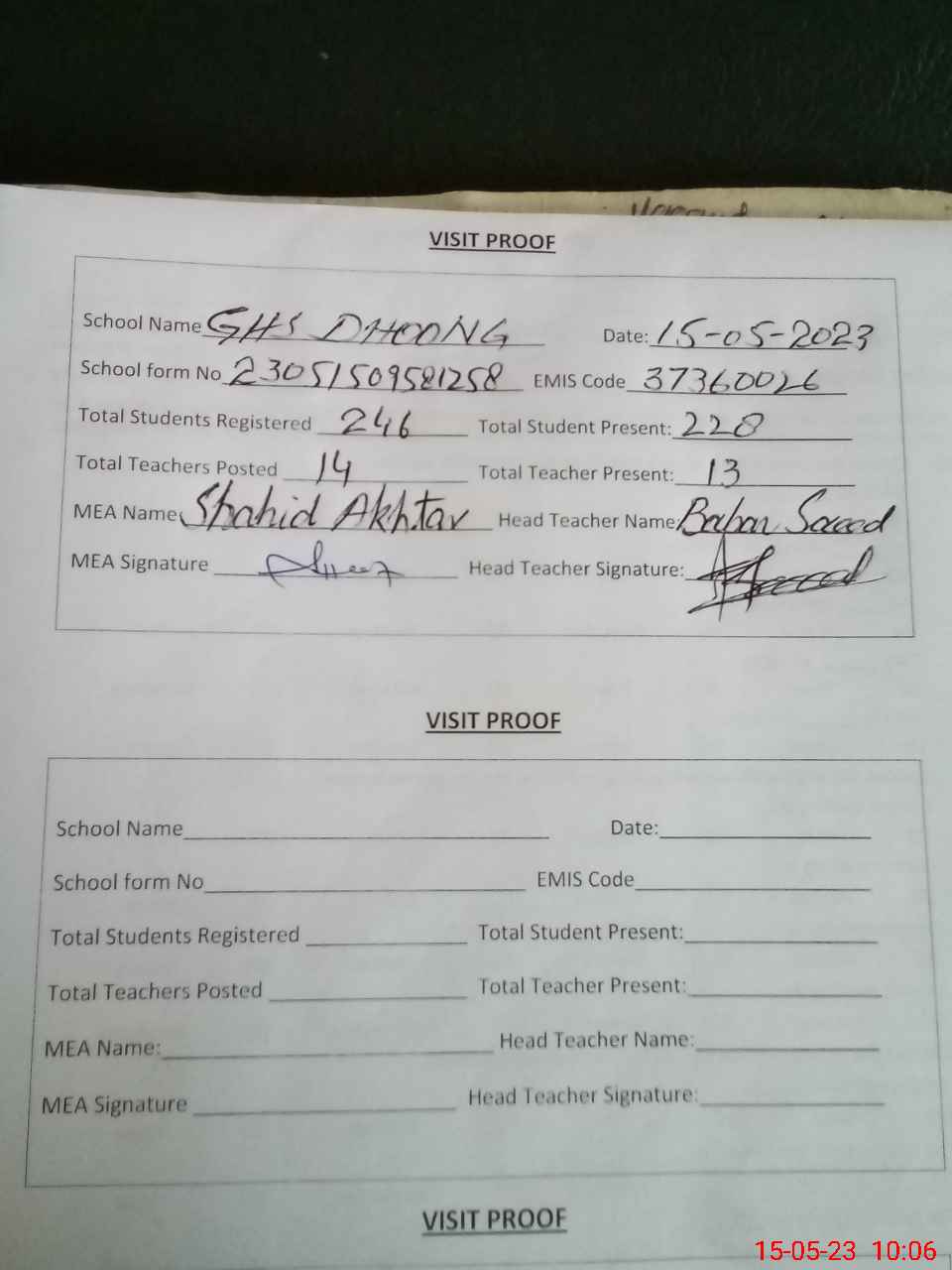| Attendance Register | Head Teacher | MEA with School | Visit Proof |