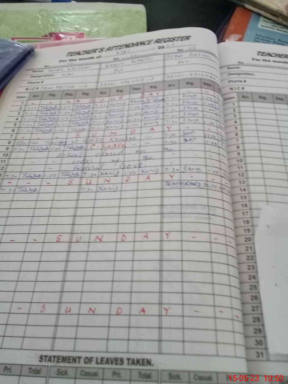| CNIC | Full Name | Designation | R/C | Absence During Last Calender Month |