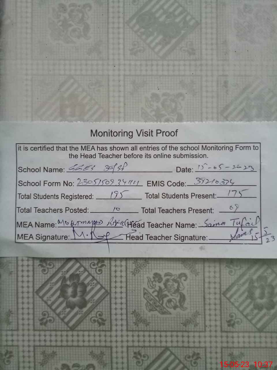 | Certified that this School was Inspected by the Undersigned MEA/DMO Today and the Information Stated Above is as Per Record. | |||||