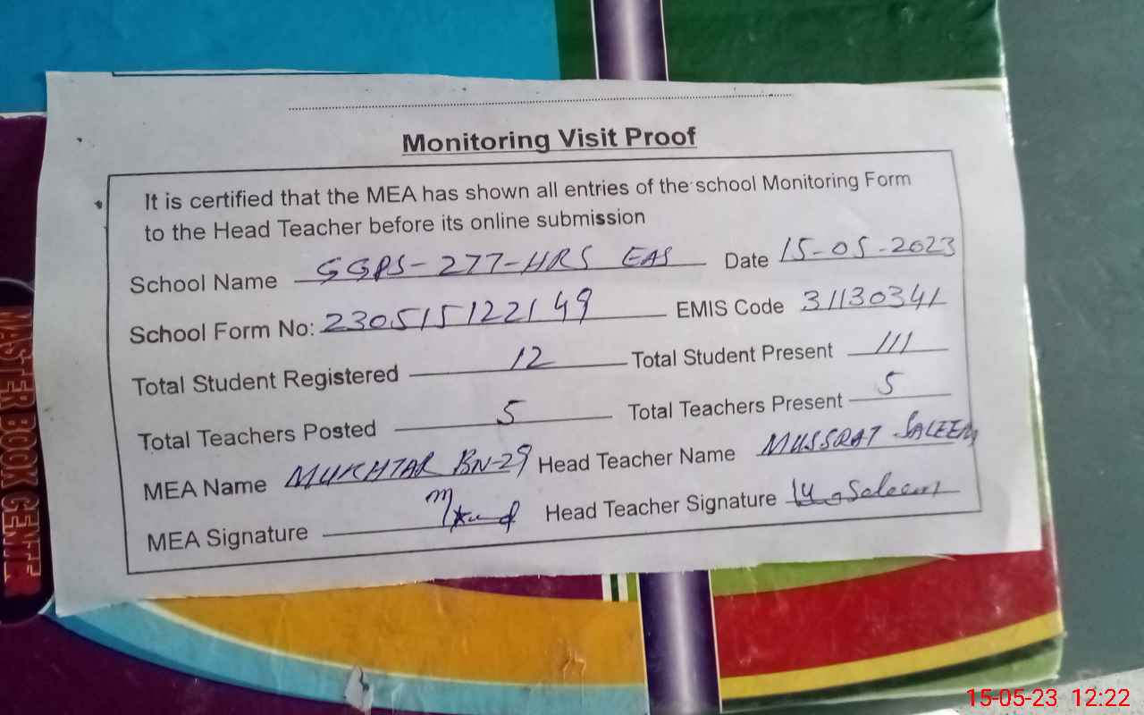 | EMIS Code: 31130341 | Name of School: GMPS CHAK NO 277 HR W | |||