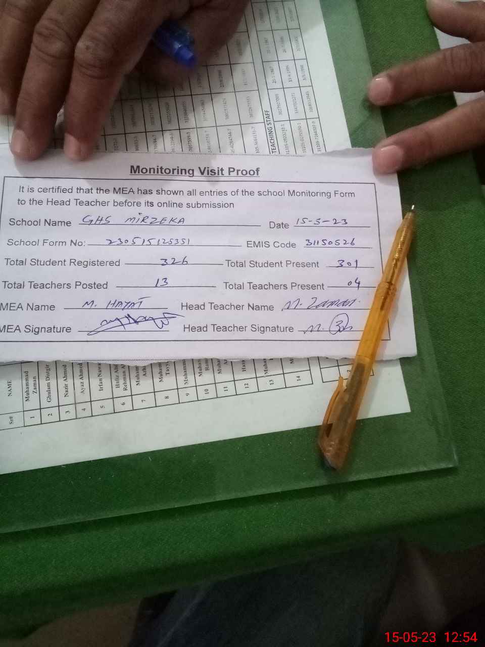 | Attendance Register | Head Teacher | MEA with School | Visit Proof |