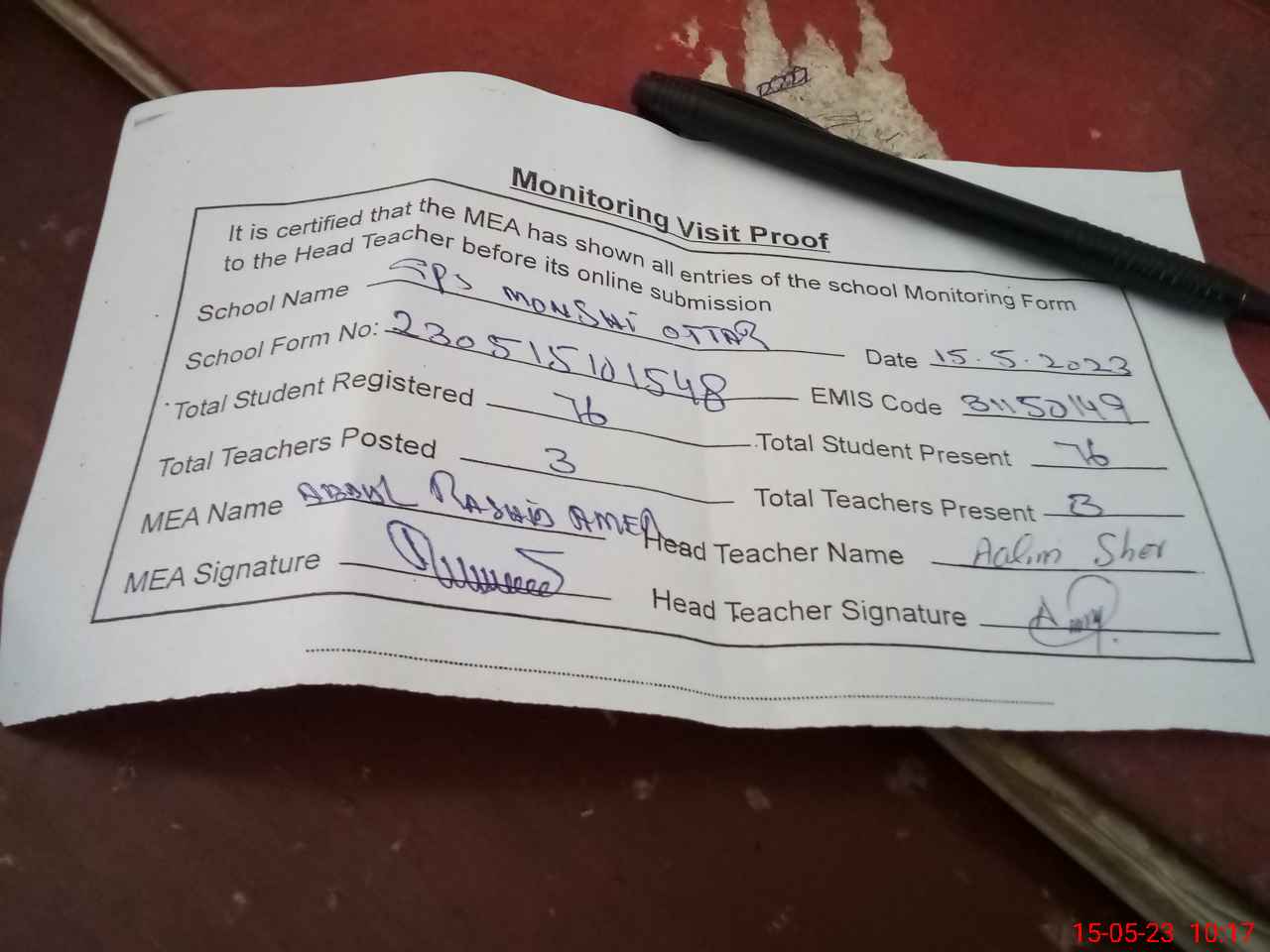 | Attendance Register | Head Teacher | MEA with School | Visit Proof |