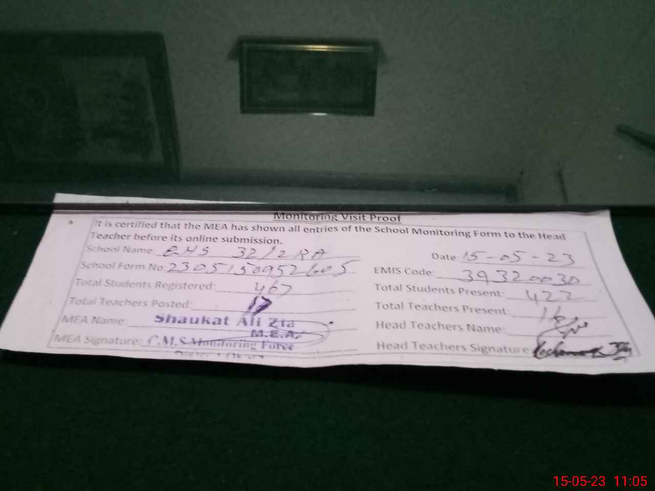 | Monitoring Date: 15-05-2023 | Start Time: 15-05-2023 09:52 AM | End Time: 15-05-2023 11:05 AM | Name of MEA: SH**** AL**** ZI**** (R**** | |