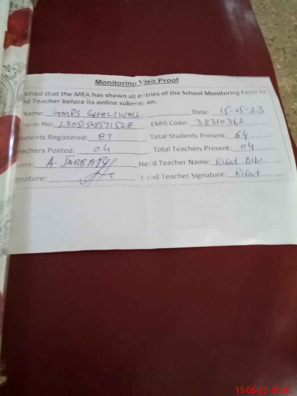 | EMIS Code: 38310362 | Name of School: GMPS GHAZI WAL | |||
