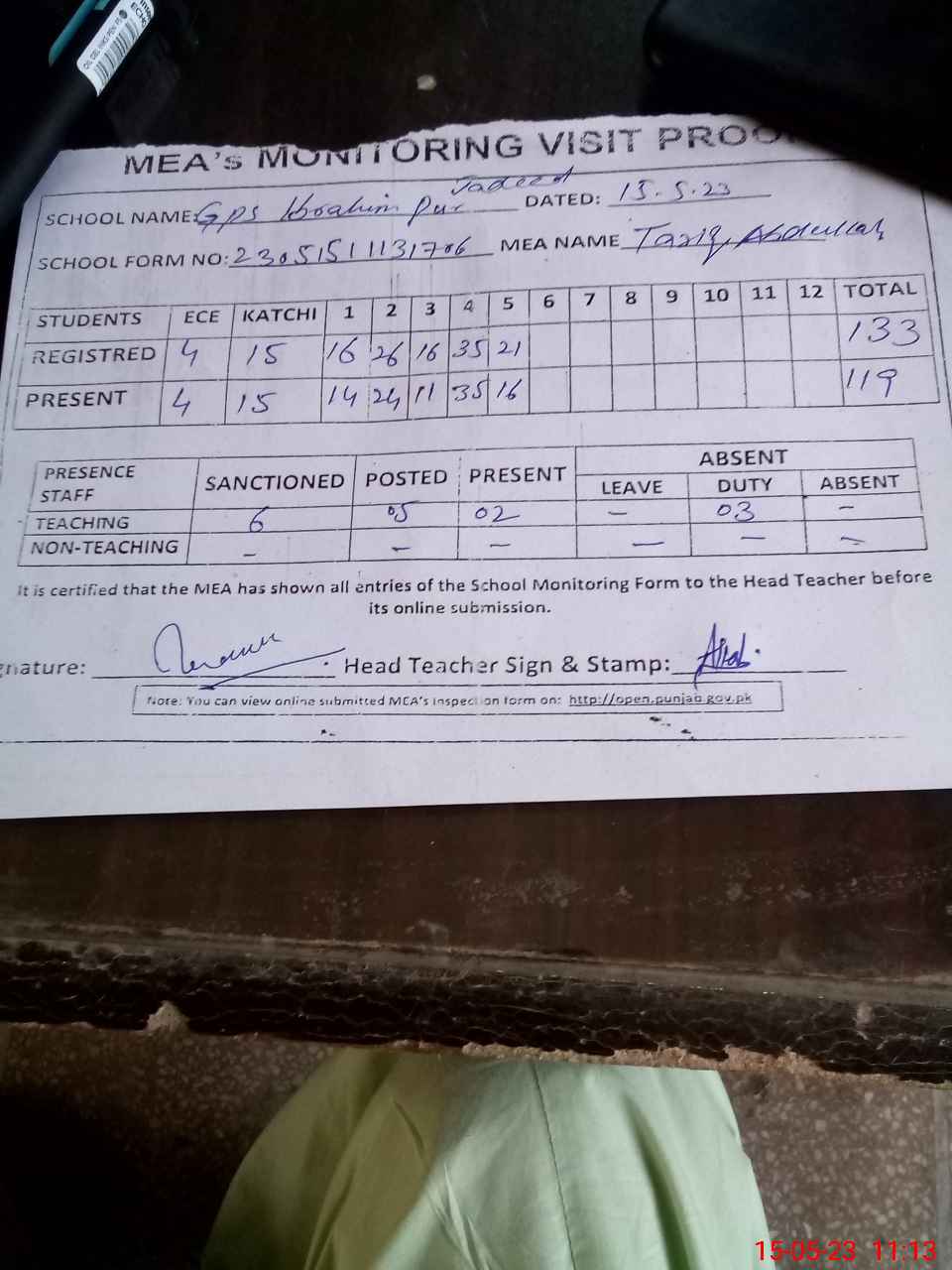| Attendance Register | Head Teacher | MEA with School | Visit Proof |