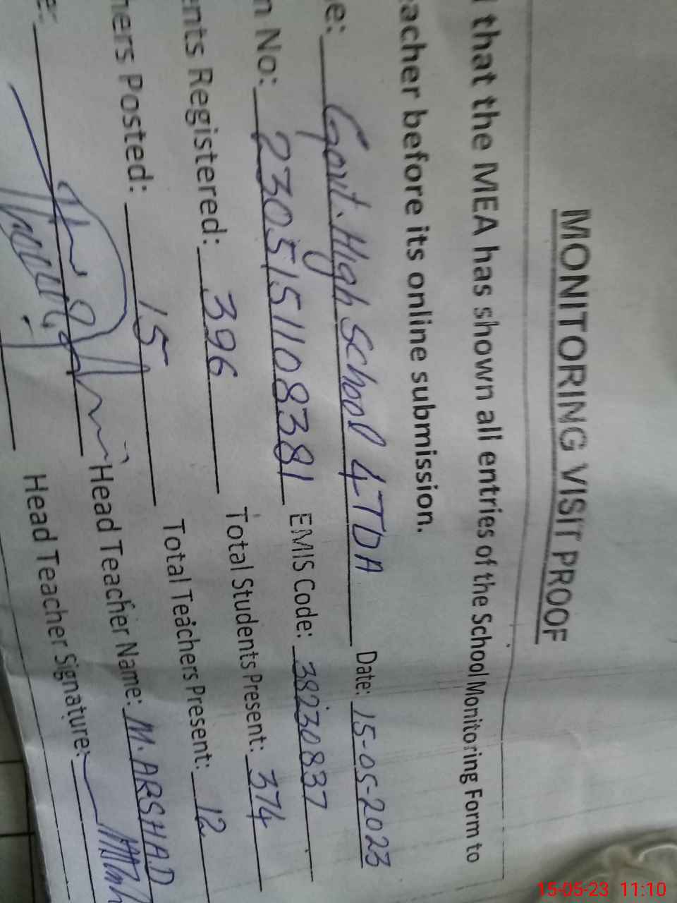 | EMIS Code: 38230837 | Name of School: GHS CHAK NO. 4 TDA | |||
