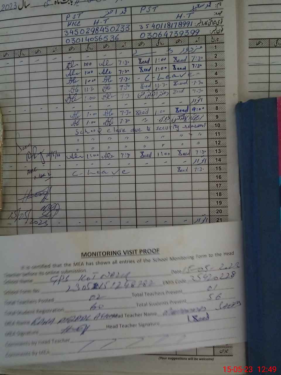 | Attendance Register | Head Teacher | MEA with School | Visit Proof |
