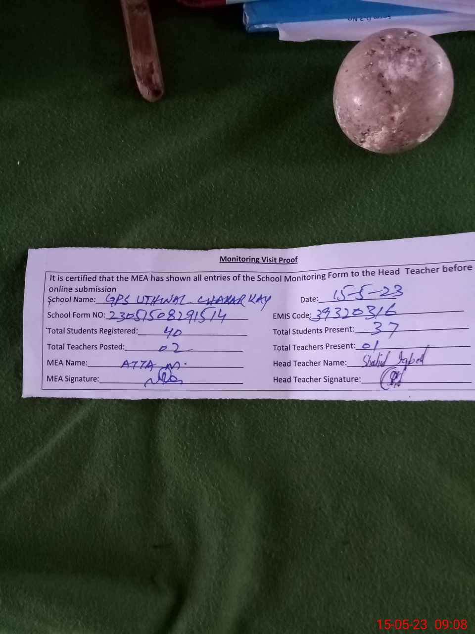 | Attendance Register | Head Teacher | MEA with School | Visit Proof |