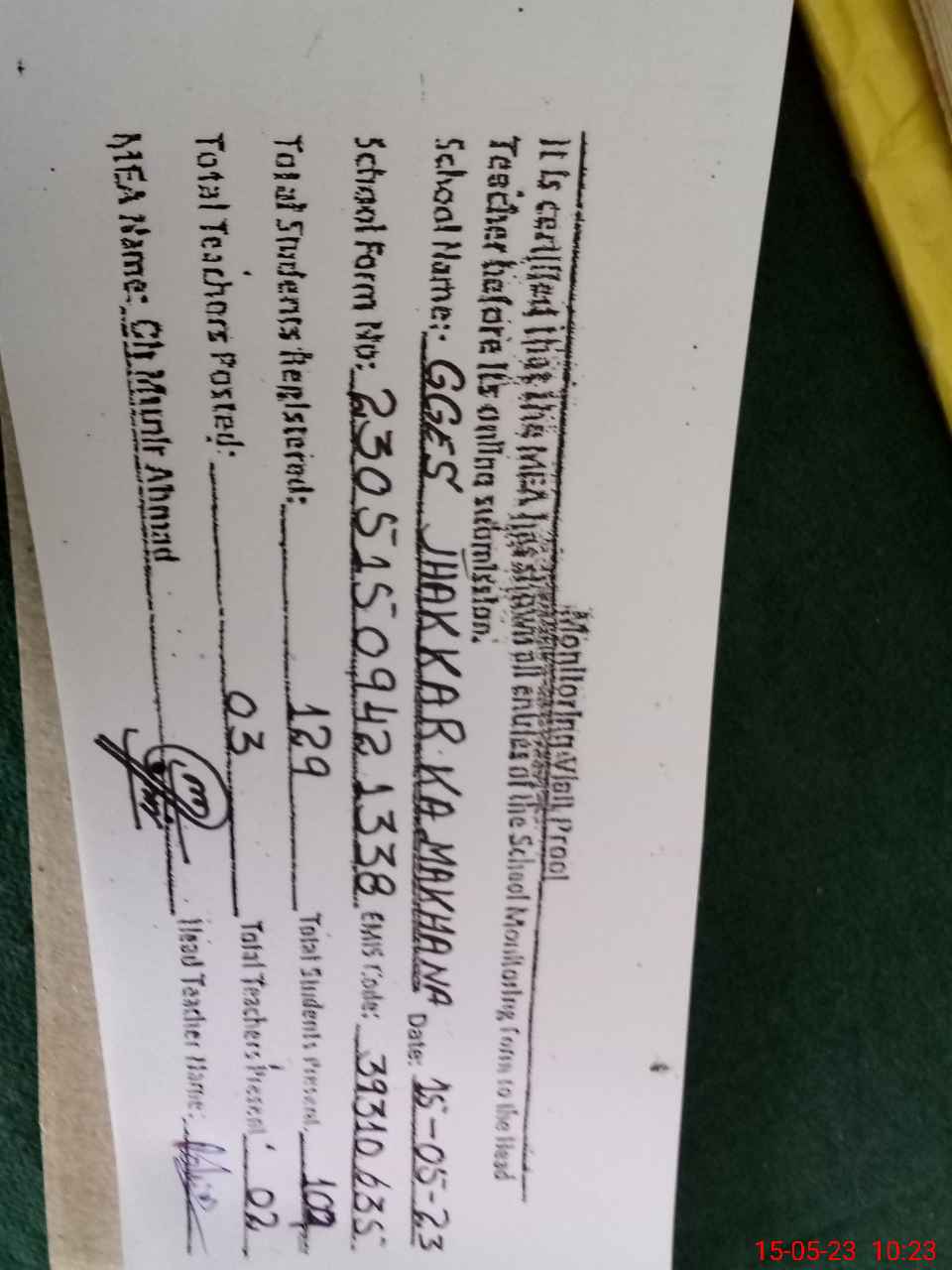 | Certified that this School was Inspected by the Undersigned MEA/DMO Today and the Information Stated Above is as Per Record. | |||||
