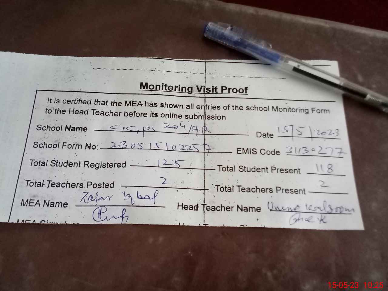 | Attendance Register | Head Teacher | MEA with School | Visit Proof |