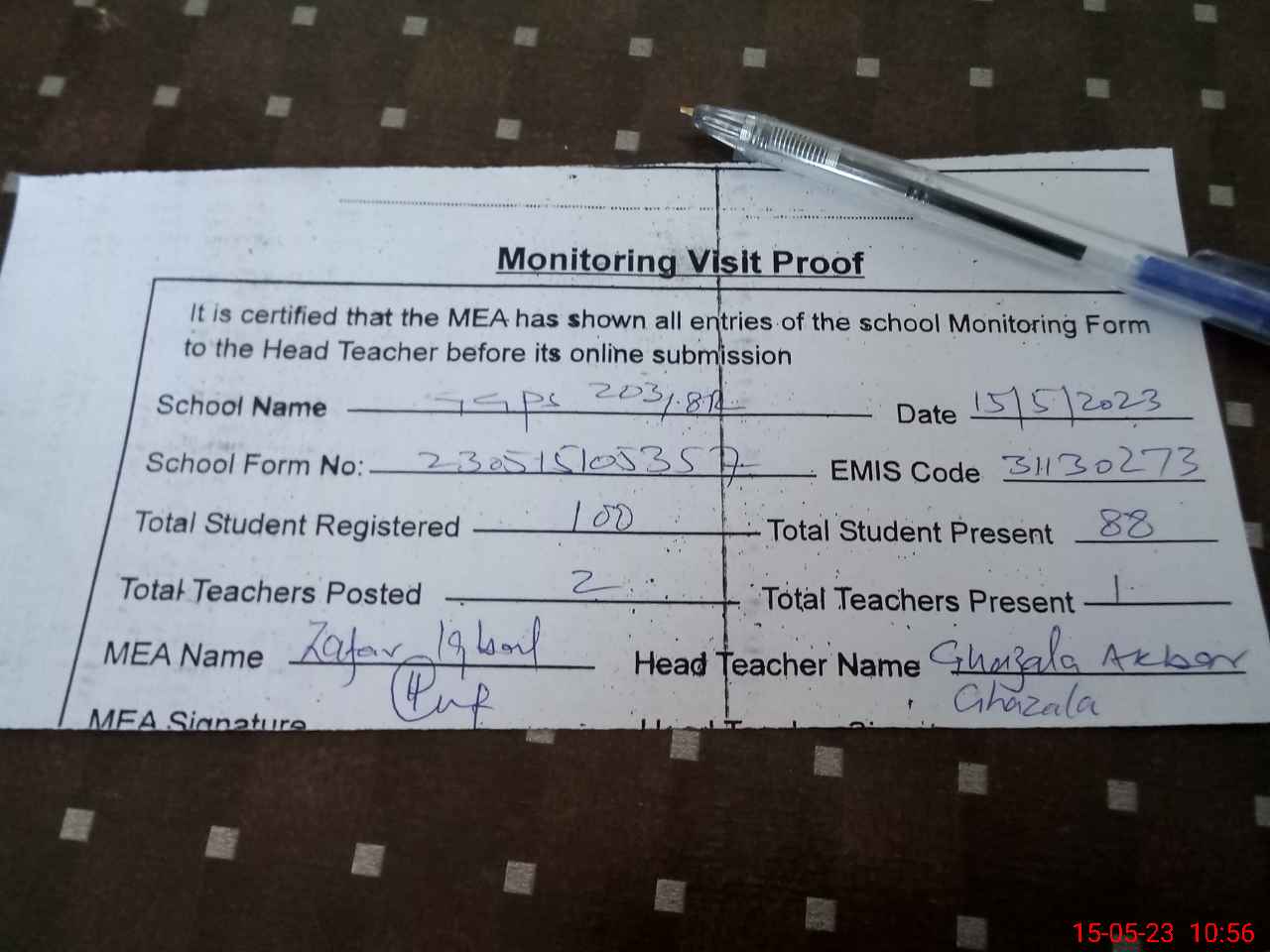 | Attendance Register | Head Teacher | MEA with School | Visit Proof |