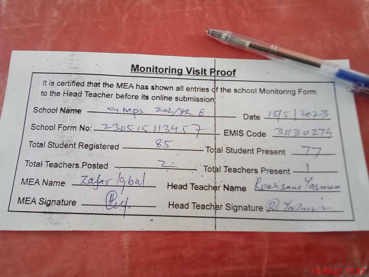 | Attendance Register | Head Teacher | MEA with School | Visit Proof |