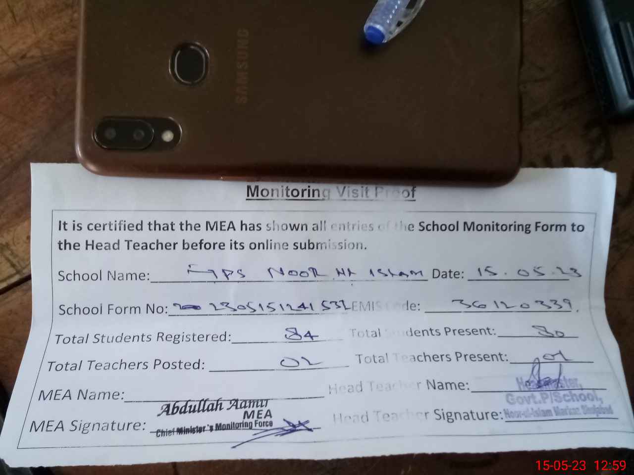 | Attendance Register | Head Teacher | MEA with School | Visit Proof |