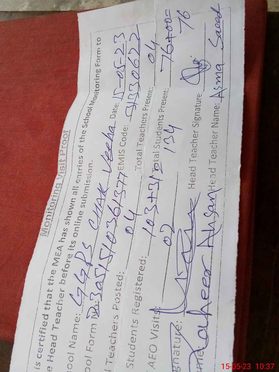 | Attendance Register | Head Teacher | MEA with School | Visit Proof |