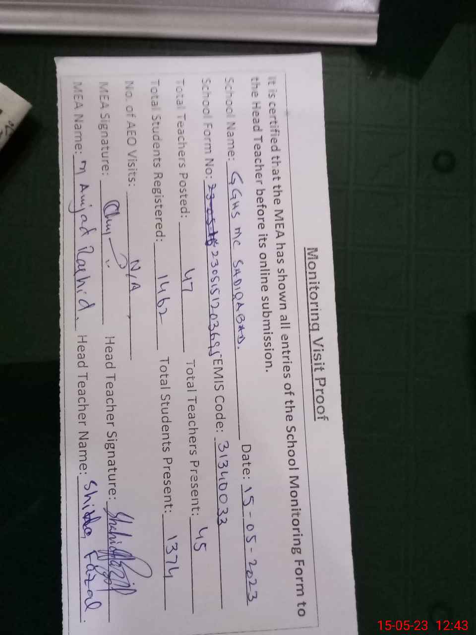 | Attendance Register | Head Teacher | MEA with School | Visit Proof |