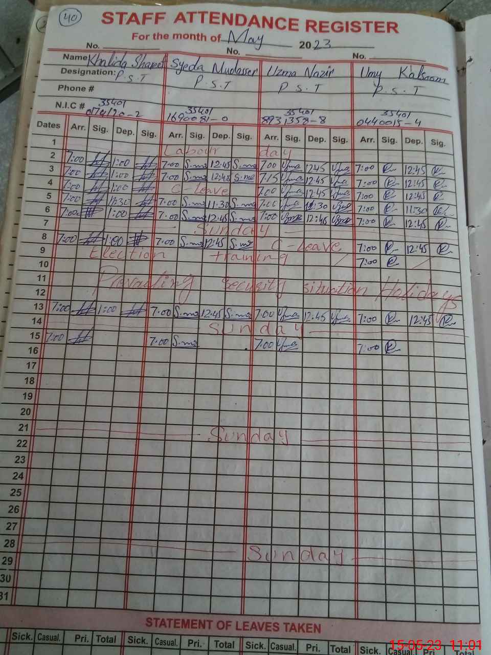 | CNIC | Full Name | Designation | R/C | Absence During Last Calender Month |