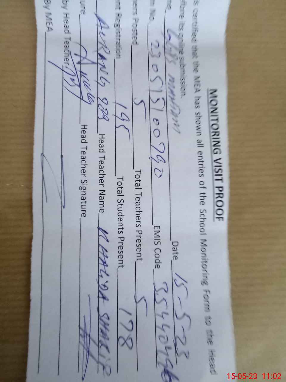 | Attendance Register | Head Teacher | MEA with School | Visit Proof |