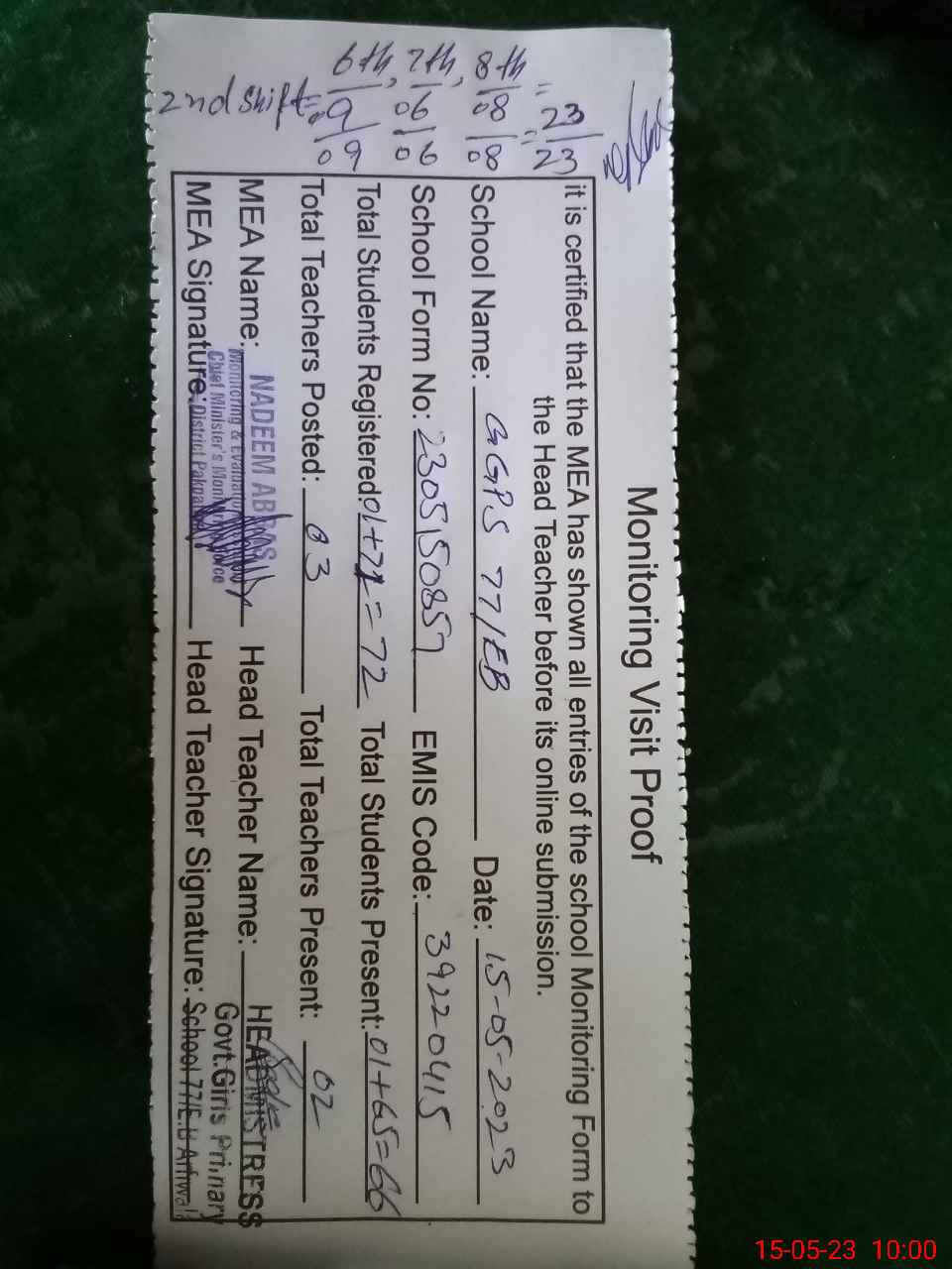 | Attendance Register | Head Teacher | MEA with School | Visit Proof |