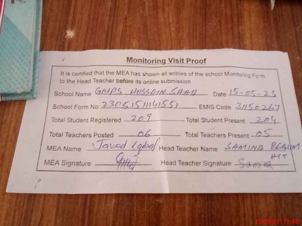 | Attendance Register | Head Teacher | MEA with School | Visit Proof |