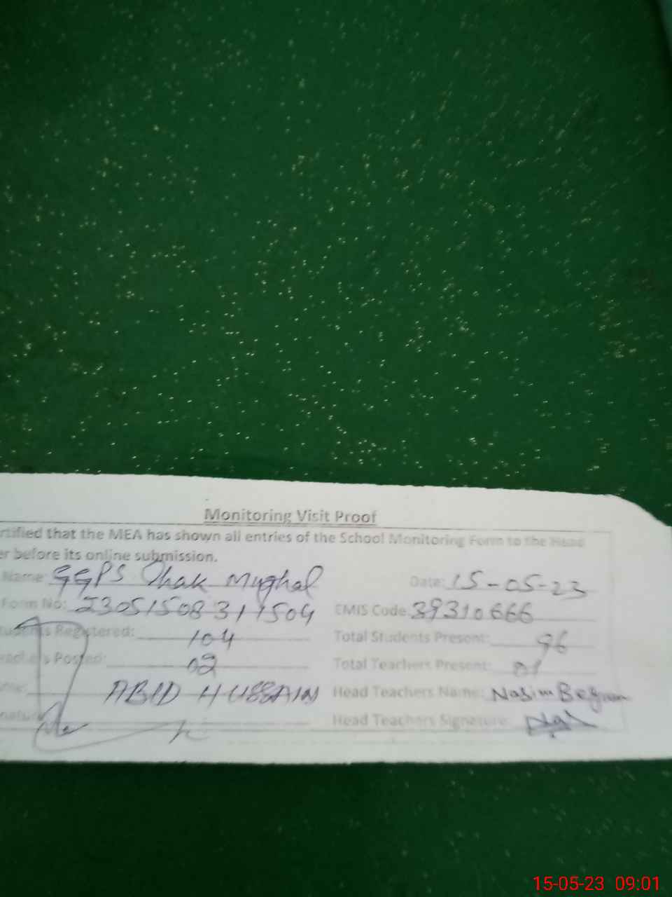 | Attendance Register | Head Teacher | MEA with School | Visit Proof |