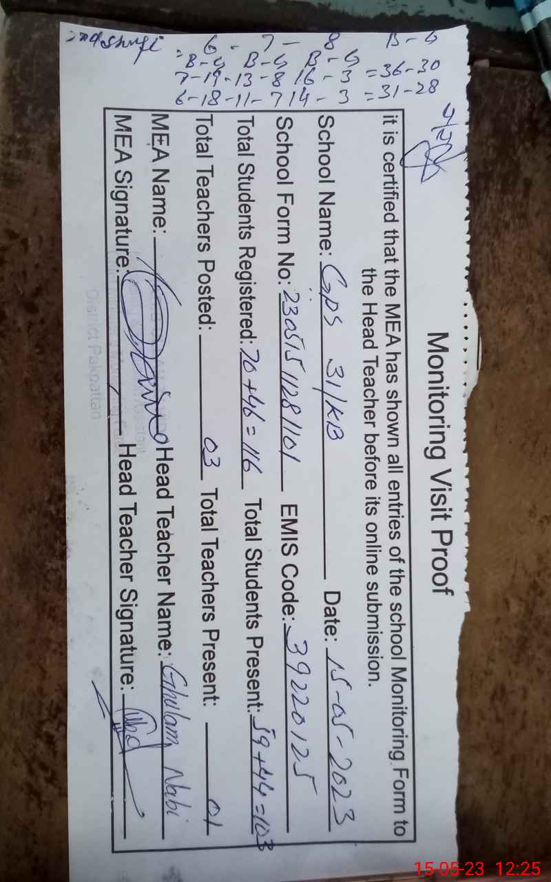 | EMIS Code: 39220125 | Name of School: GPS CHAK NO. 31 KB | |||