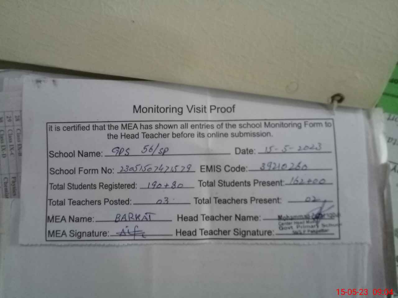 | Attendance Register | Head Teacher | MEA with School | Visit Proof |