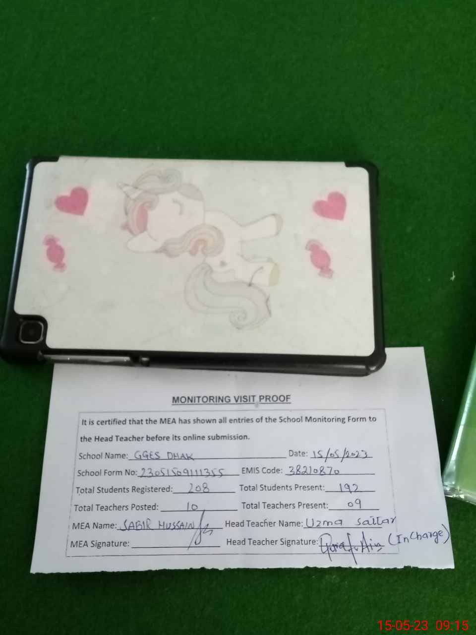 | Attendance Register | Head Teacher | MEA with School | Visit Proof |