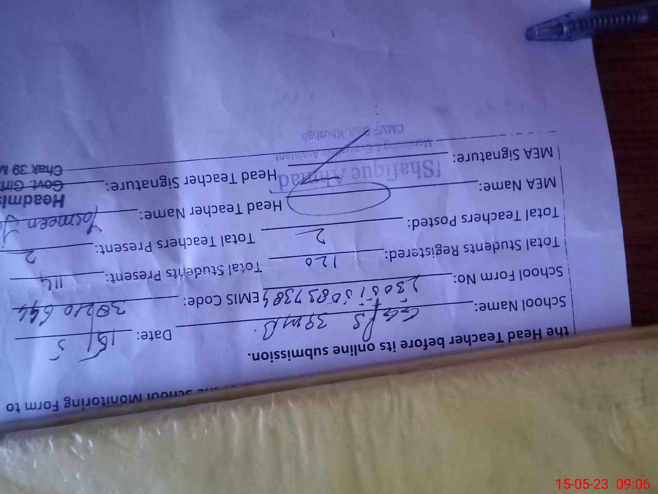 | Attendance Register | Head Teacher | MEA with School | Visit Proof |