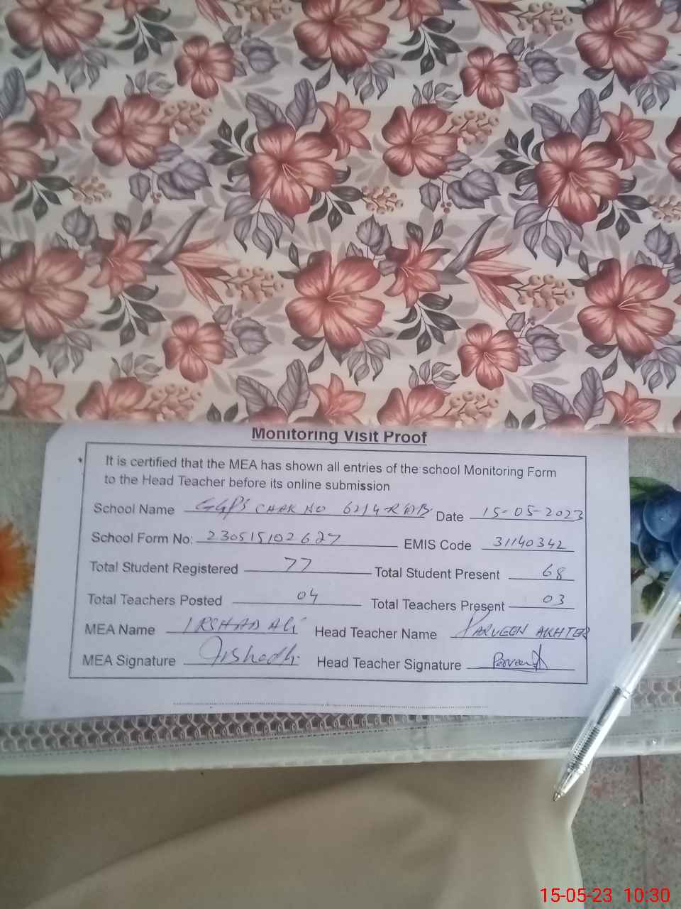 | Attendance Register | Head Teacher | MEA with School | Visit Proof |
