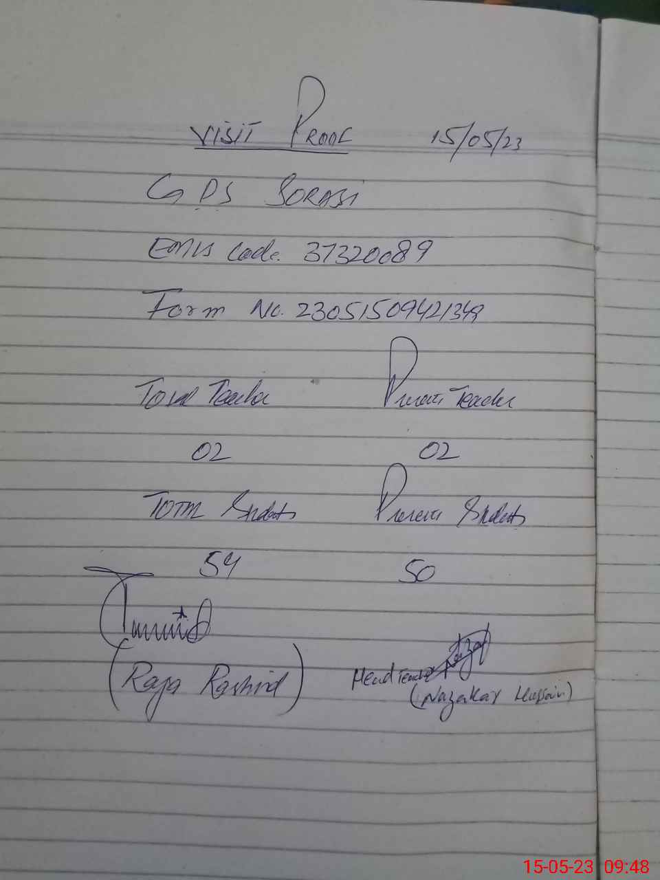 | Attendance Register | Head Teacher | MEA with School | Visit Proof |