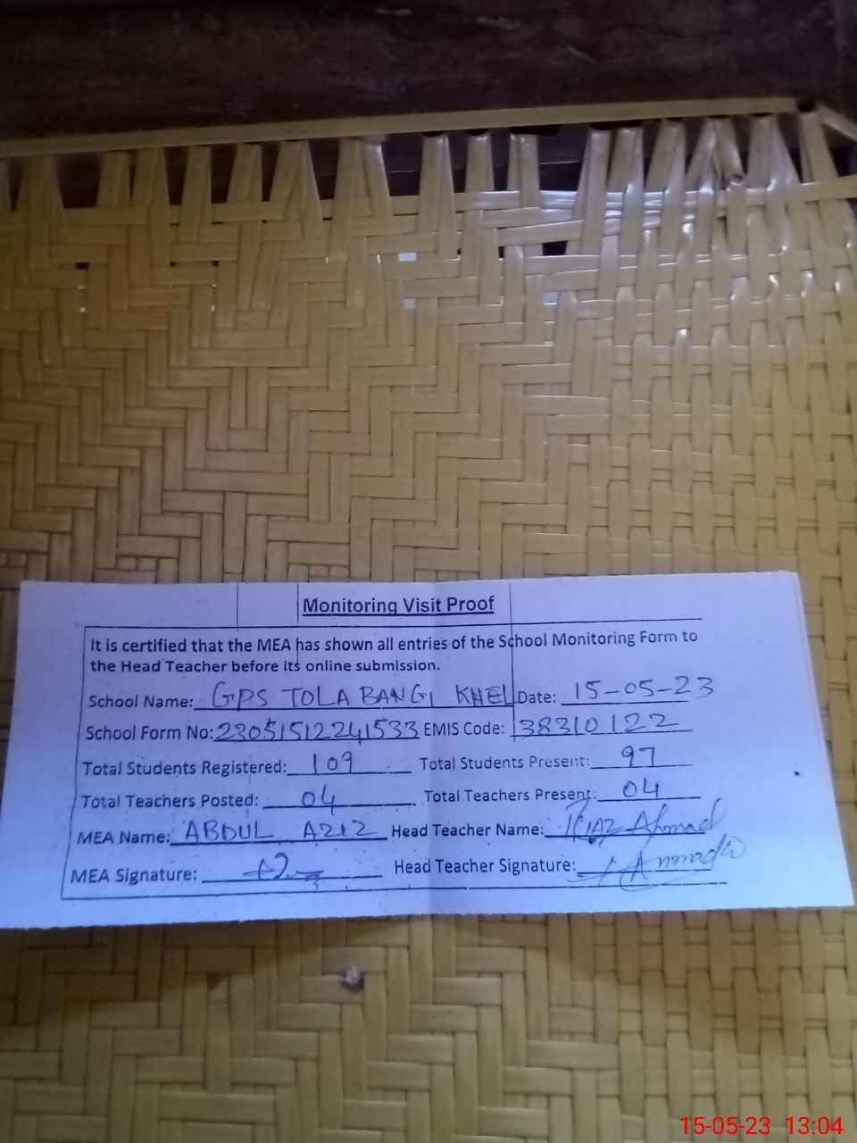 | EMIS Code: 38310122 | Name of School: GPS TOLA BANGE KHEL | |||