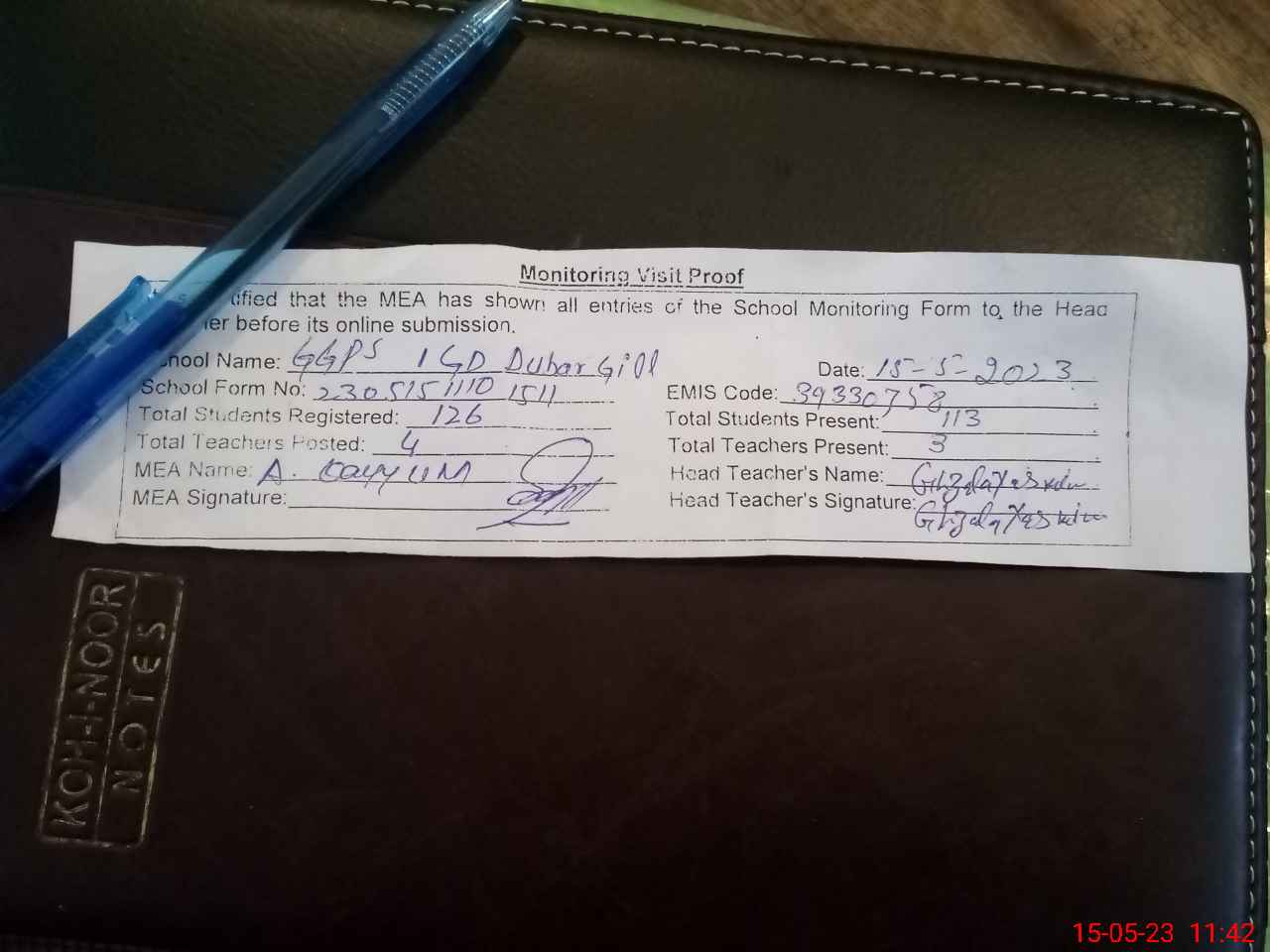 | Attendance Register | Head Teacher | MEA with School | Visit Proof |