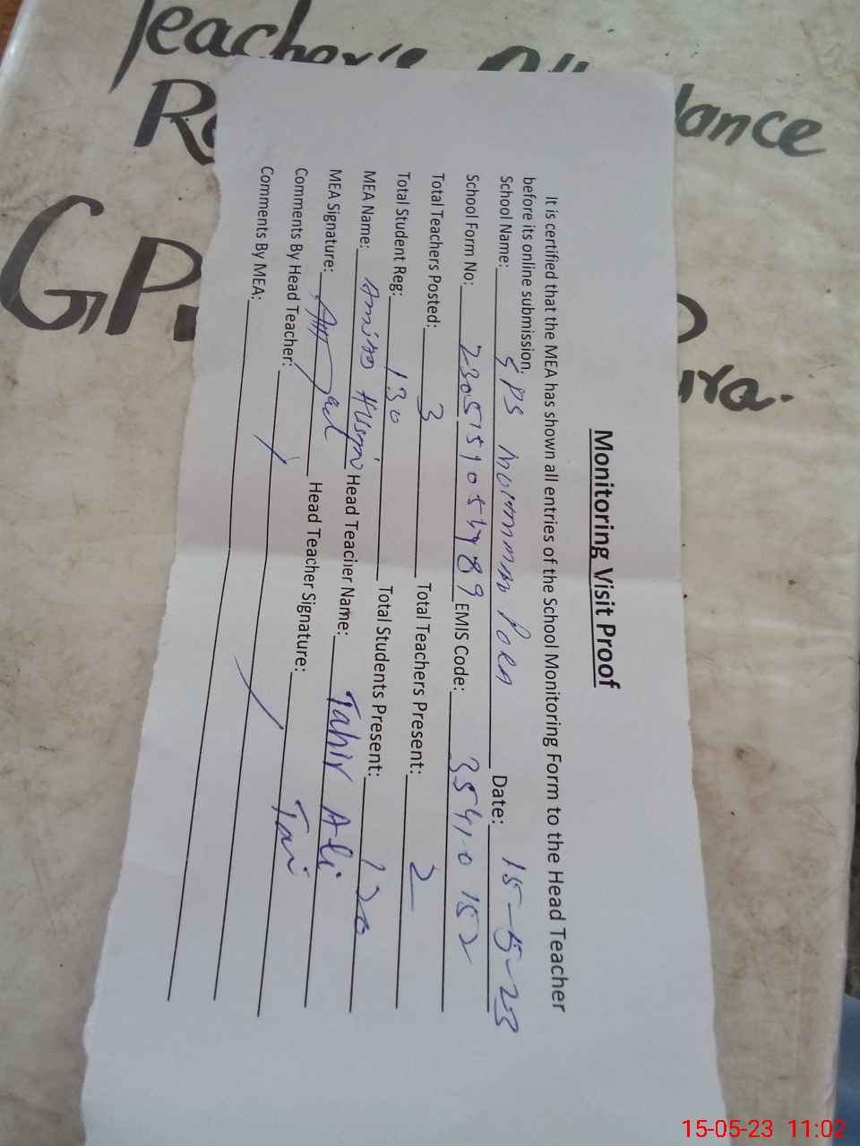 | Attendance Register | Head Teacher | MEA with School | Visit Proof |