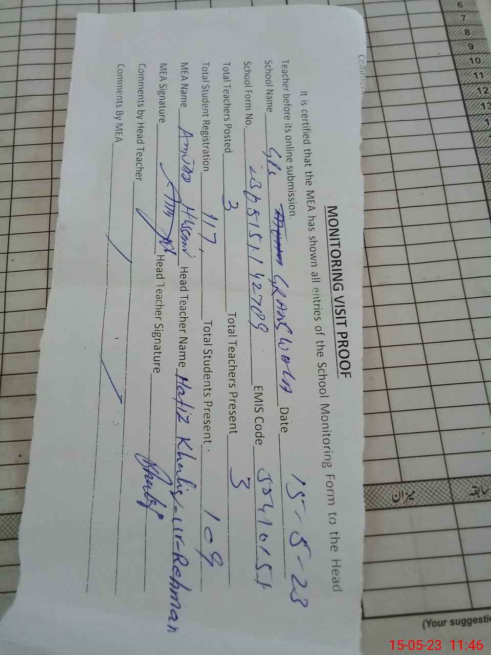 | Attendance Register | Head Teacher | MEA with School | Visit Proof |