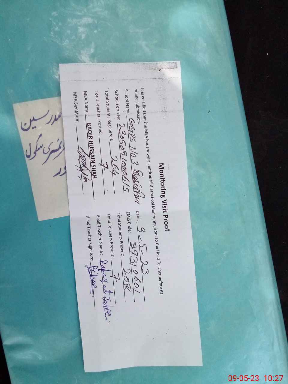 | Attendance Register | Head Teacher | MEA with School | Visit Proof |