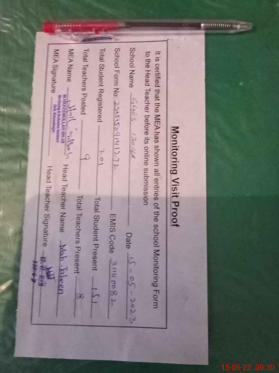 | Attendance Register | Head Teacher | MEA with School | Visit Proof |