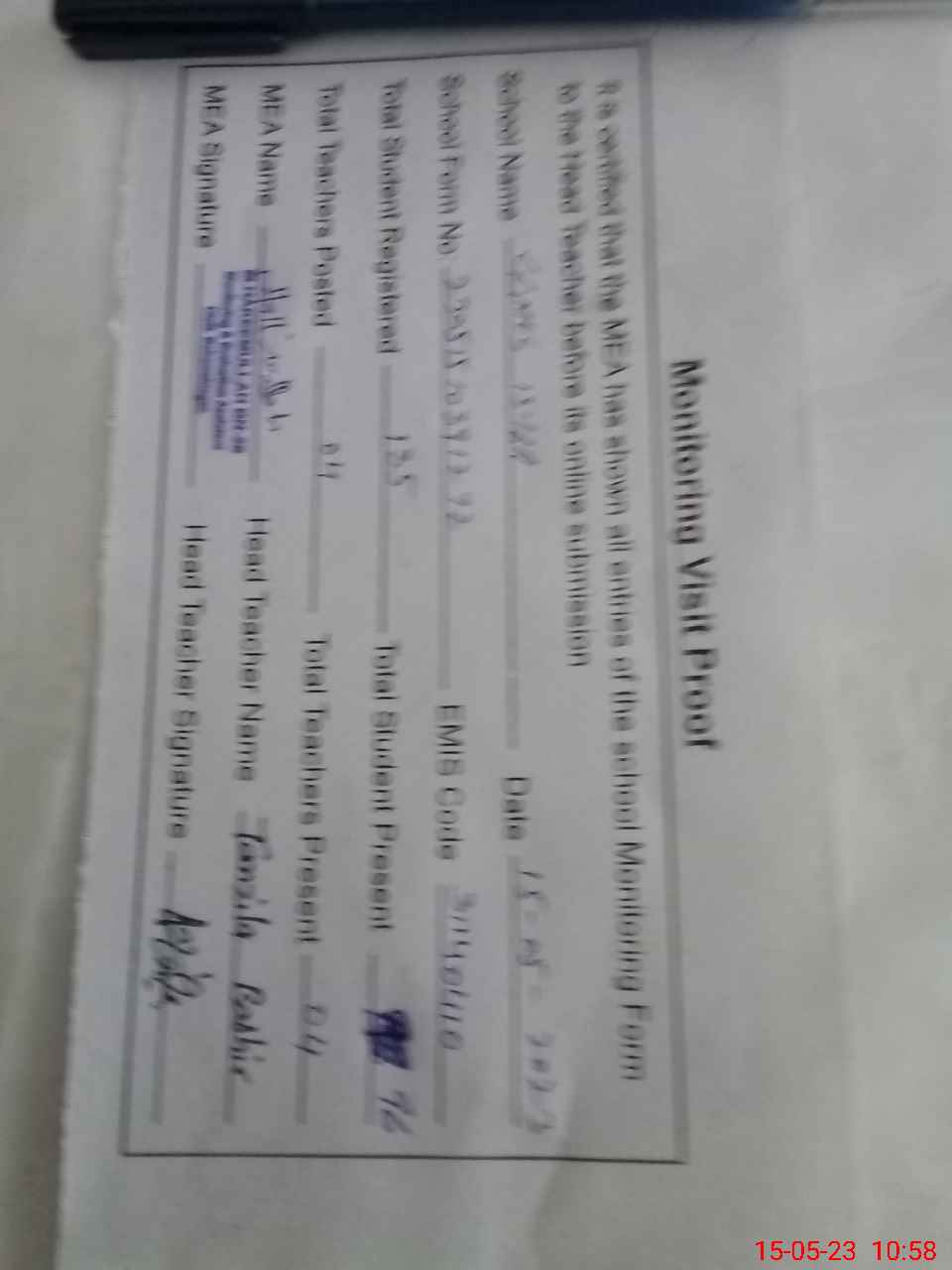 | Attendance Register | Head Teacher | MEA with School | Visit Proof |