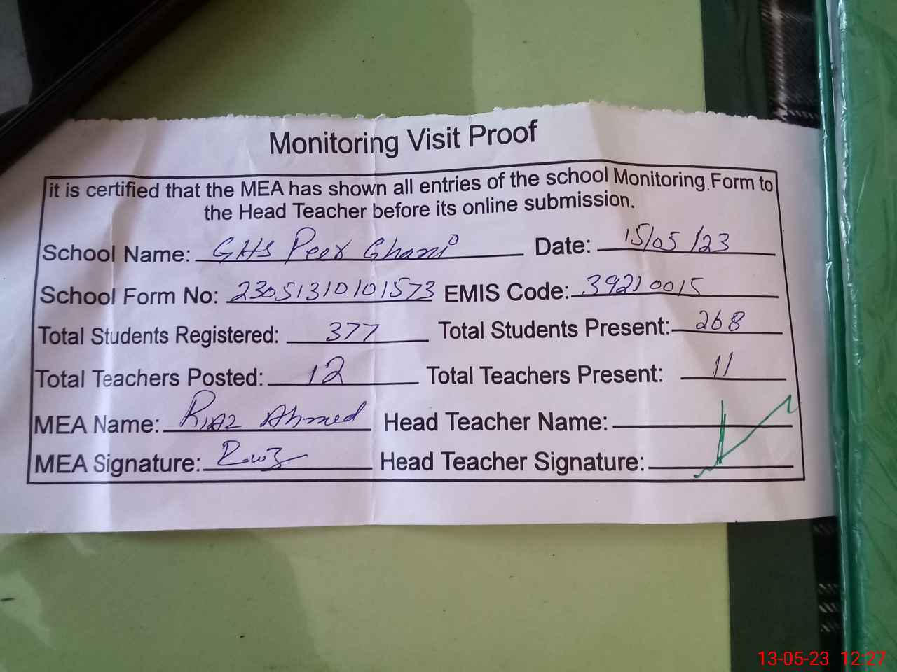 | EMIS Code: 39210015 | Name of School: GHS PEER GHANI | |||