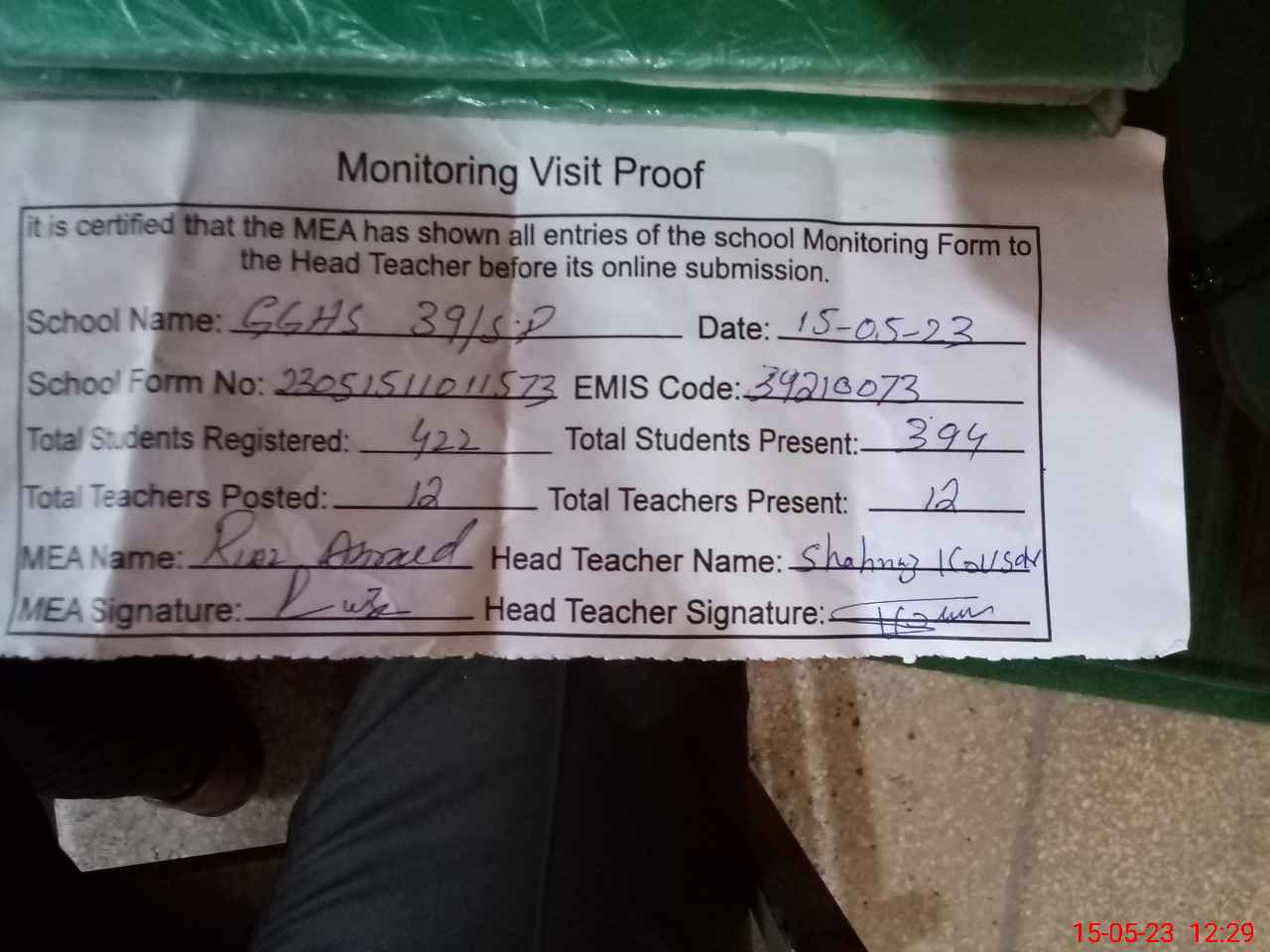 | EMIS Code: 39210073 | Name of School: GGHS CHAK NO.39 SP | |||