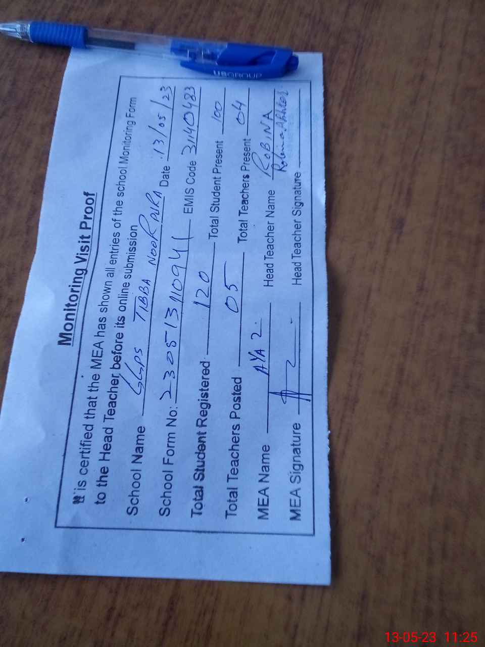 | Attendance Register | Head Teacher | MEA with School | Visit Proof |