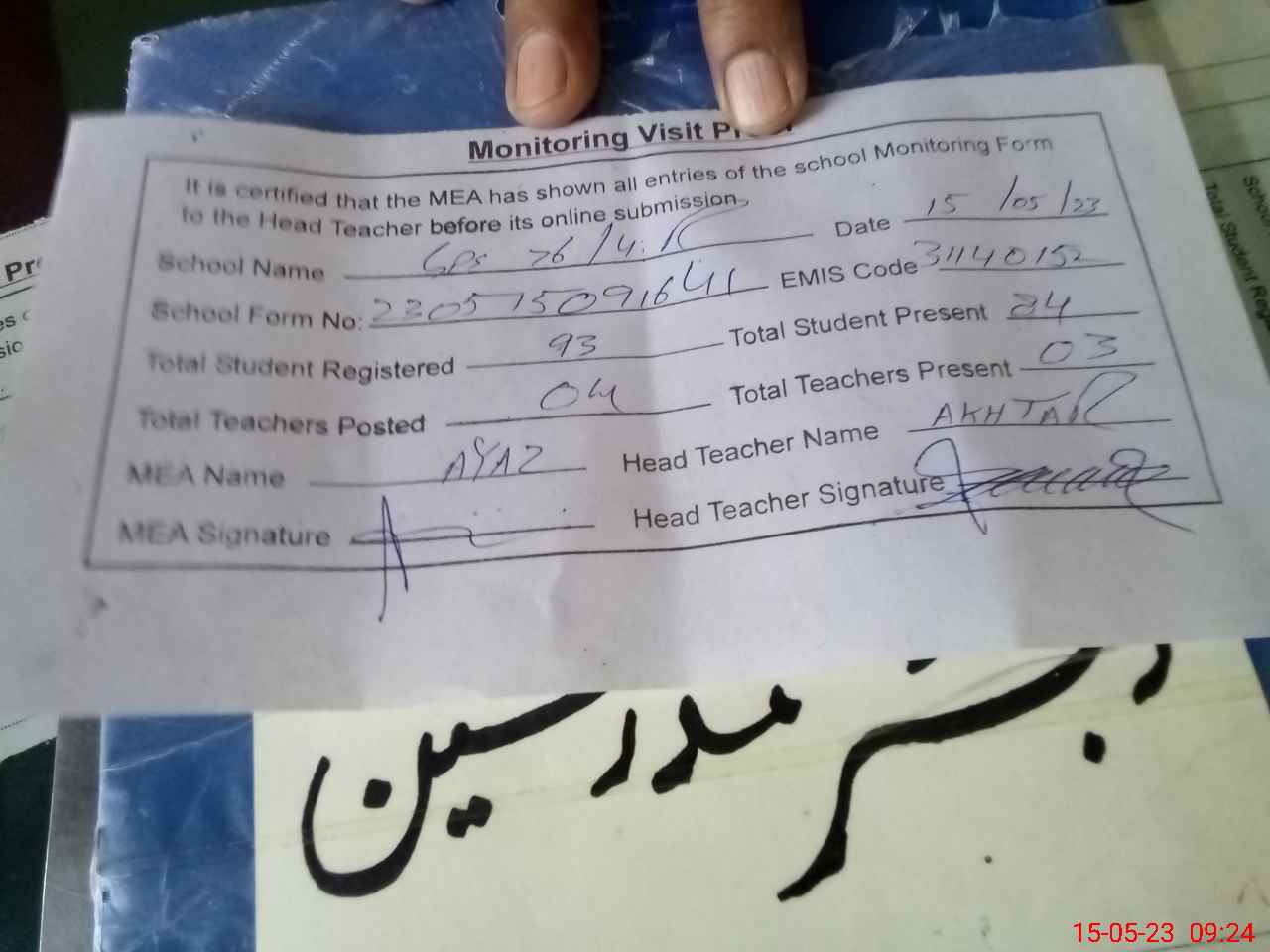 | Attendance Register | Head Teacher | MEA with School | Visit Proof |