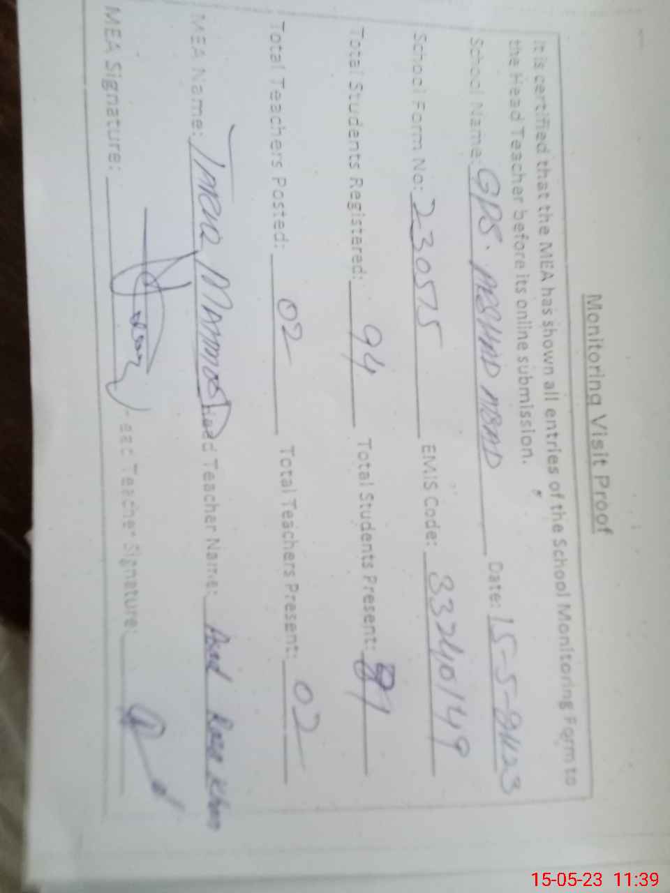 | Attendance Register | Head Teacher | MEA with School | Visit Proof |