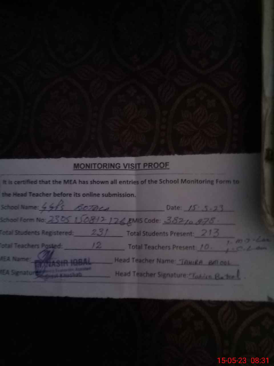 | Attendance Register | Head Teacher | MEA with School | Visit Proof |