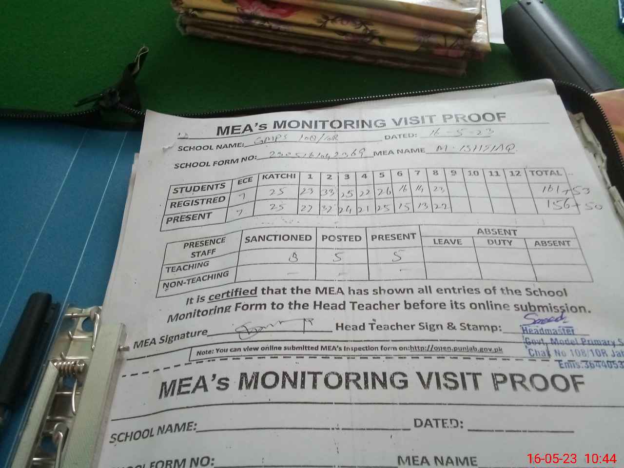 | Attendance Register | Head Teacher | MEA with School | Visit Proof |