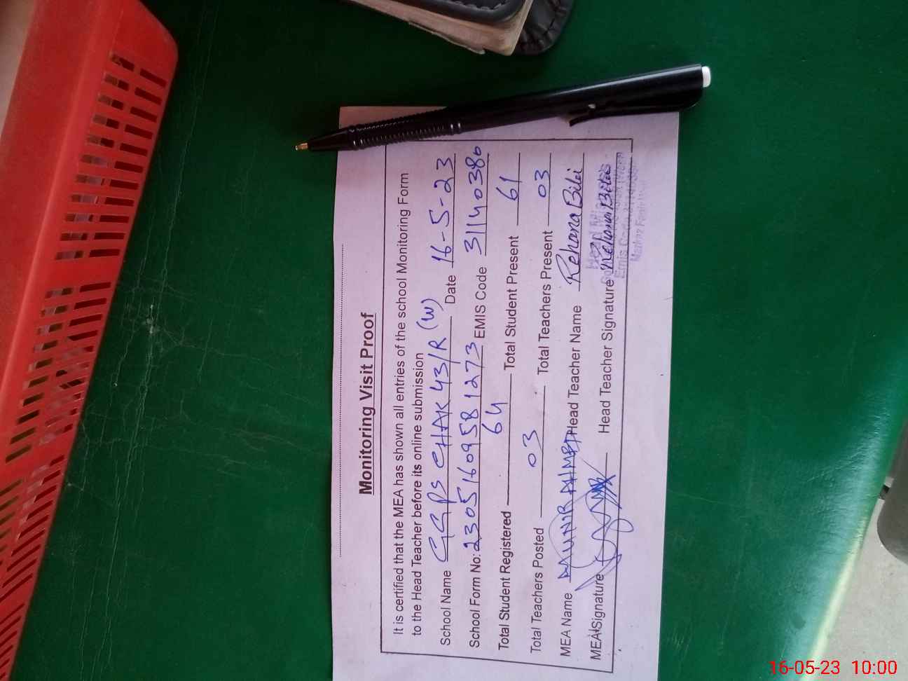 | Attendance Register | Head Teacher | MEA with School | Visit Proof |