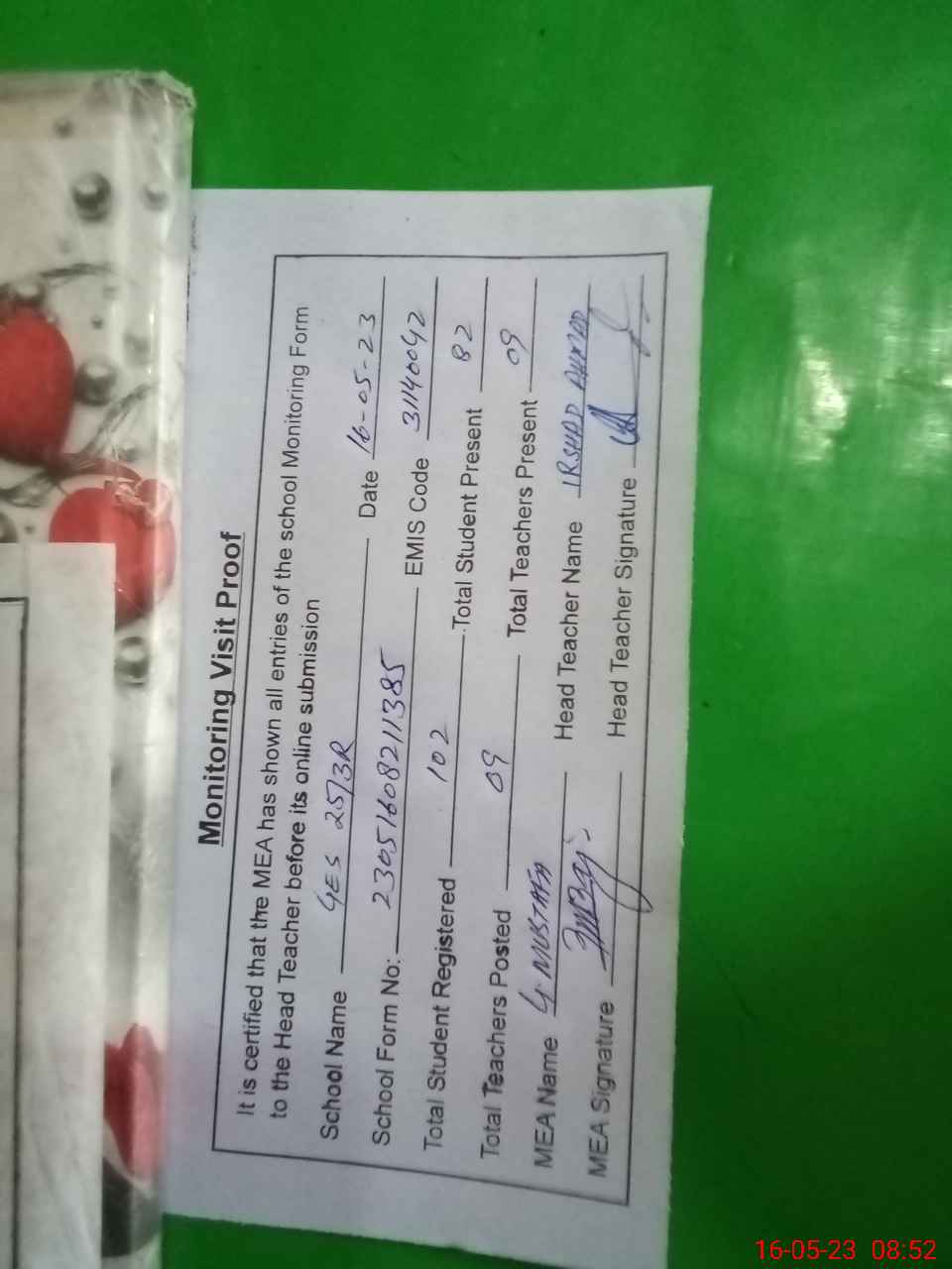 | Attendance Register | Head Teacher | MEA with School | Visit Proof |