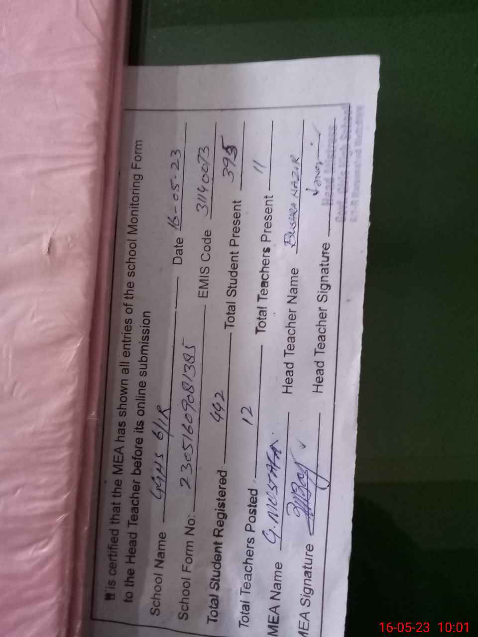 | Certified that this School was Inspected by the Undersigned MEA/DMO Today and the Information Stated Above is as Per Record. | |||||