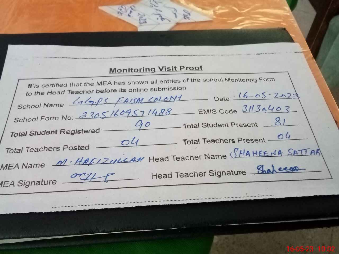 | Attendance Register | Head Teacher | MEA with School | Visit Proof |