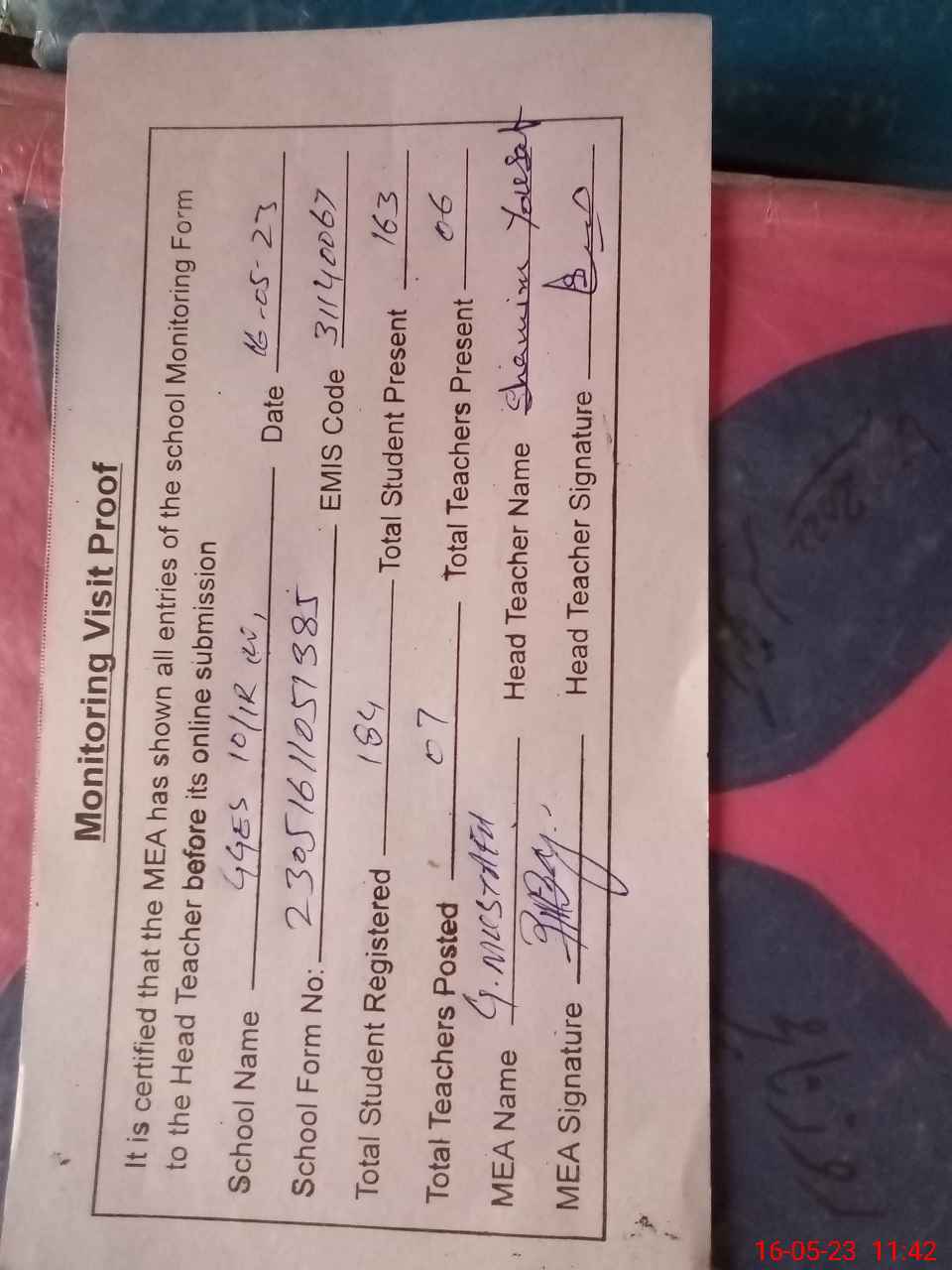 | Attendance Register | Head Teacher | MEA with School | Visit Proof |